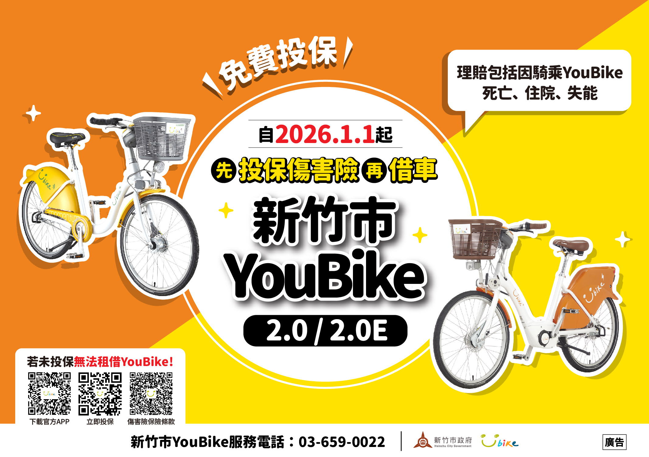考量民眾往來交通節點、學校、各級機關、觀光景點、旅遊中心及活動中心等場所頻繁、新竹科學園區、大專院校及各級學校,亦有學術商務交流,請各單位協助利用各式管道,宣導租借YouBike2.0全車種前需完成投保傷害險、投保免費及如何加保等資訊,自115年1月1日起,未投保傷害險無法借車。 |