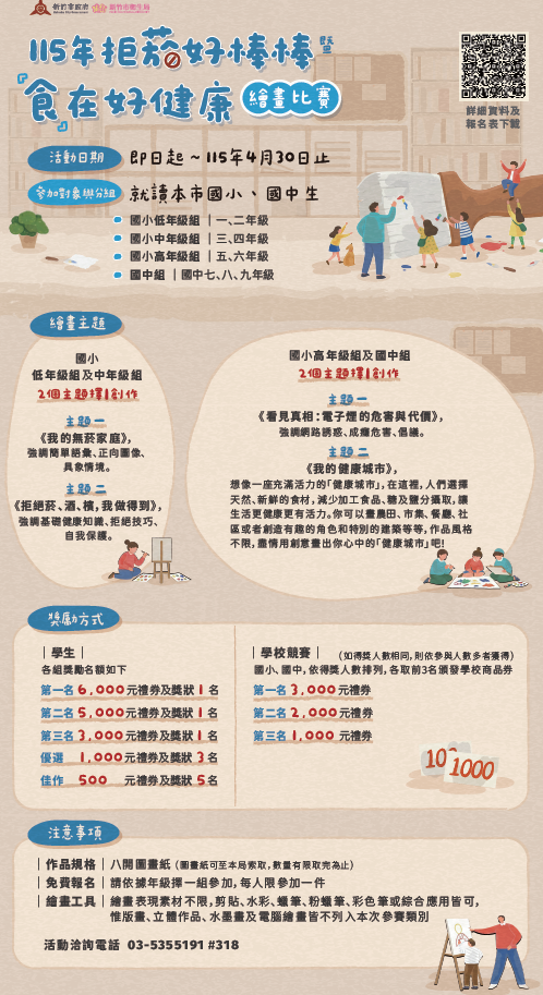 | 五、 | 相關活動內容如附件,亦可至新竹市衛生局官方網站『拒菸好棒棒』暨『食』在好健康繪畫比賽活動頁面(網址)下載,完成之作品請郵寄至新竹市中央路241號11樓國民健康科菸害小組收。 |