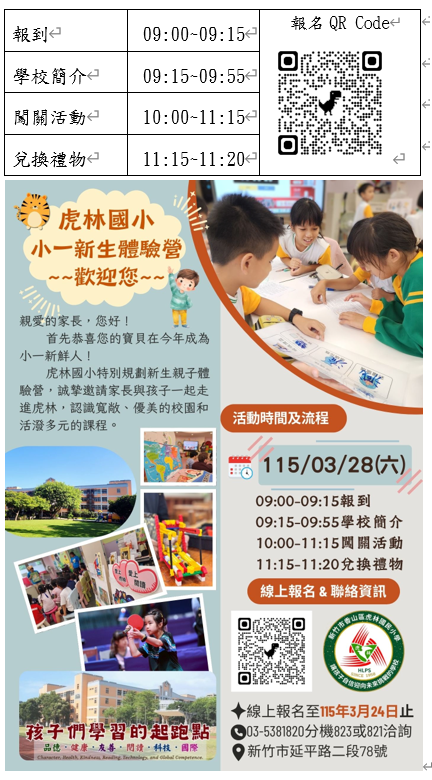 115/03/28(六)115學年小一新生體驗營,報名網址https://reurl.cc/Dxv6yE
